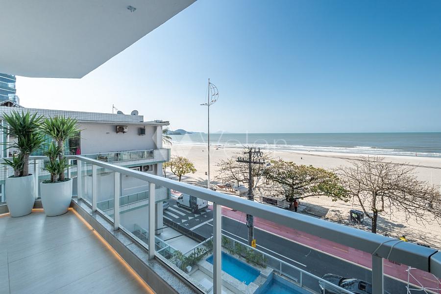 Apartamento frente mar, amplo com 145 m², privativos, decorado e equipado, 4 dormitórios sendo 2 suítes, sacada externa vista para toda a praia.